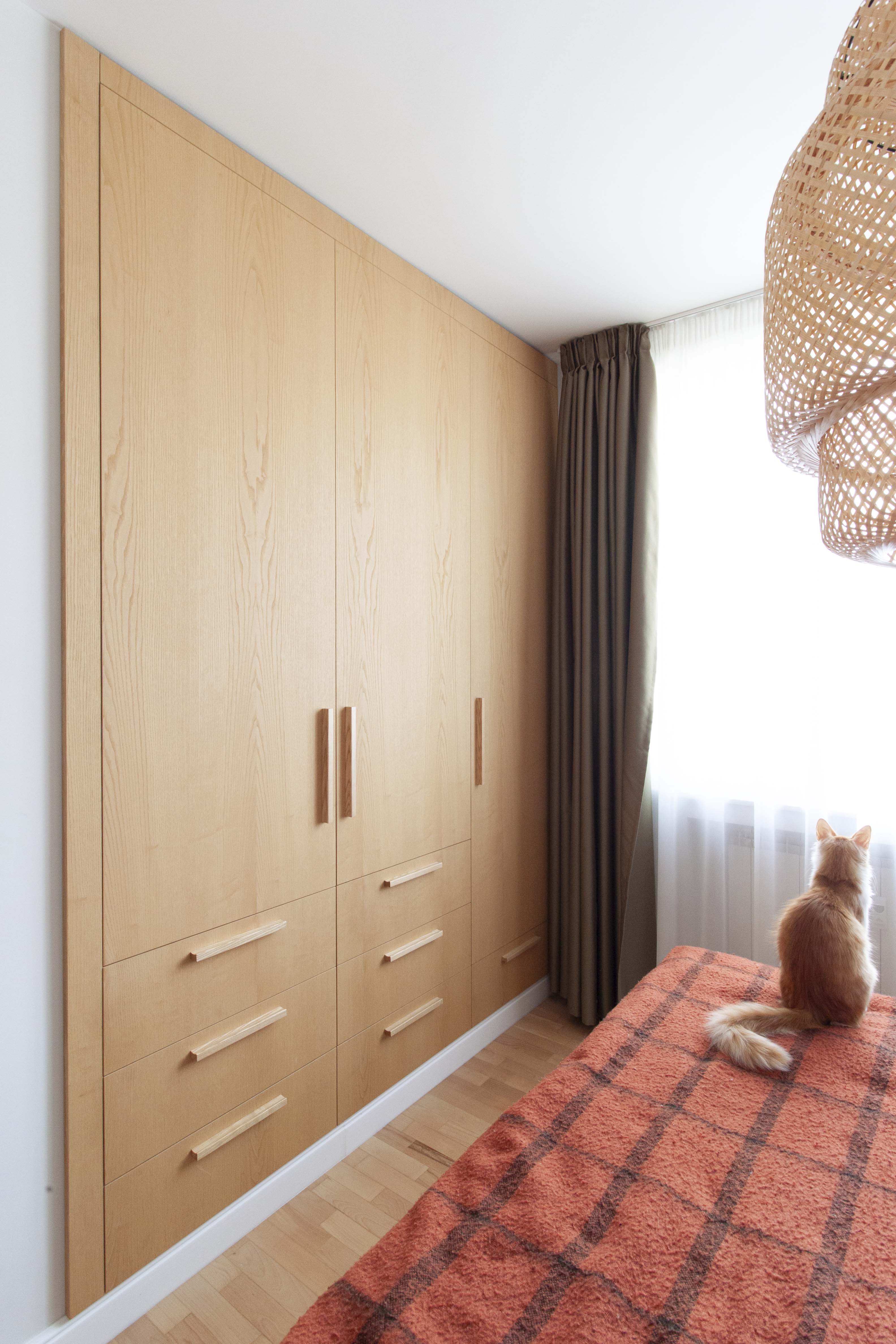 In this project, we had the opportunity to create a series of console and wall-mounted shelves, utilizing our unique detail with brass hangers. We designed a TV cabinet with solid legs and several built-in wardrobes. The furniture is minimalist, with a clear function and dimensions defined by the spaces. The primary visible material is MDF panels with oak veneer, which contributes to a warm and cozy atmosphere in the rooms.