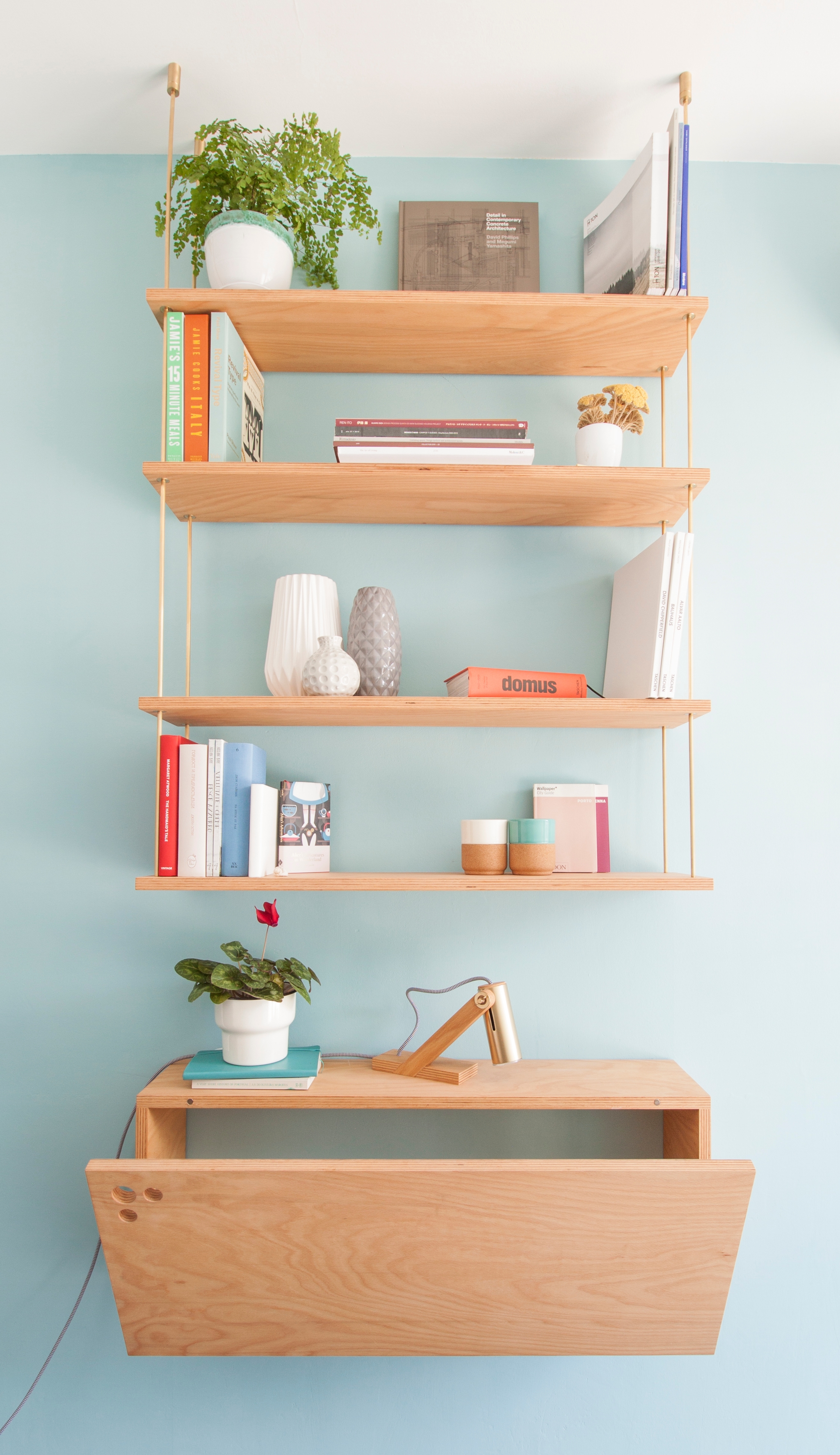 The library itself is suspended on custom-made brass rods that are elegantly integrated into the plywood shelves. Below it, a sleek folding desk offers the perfect space for composing music, without disrupting the room’s flow.