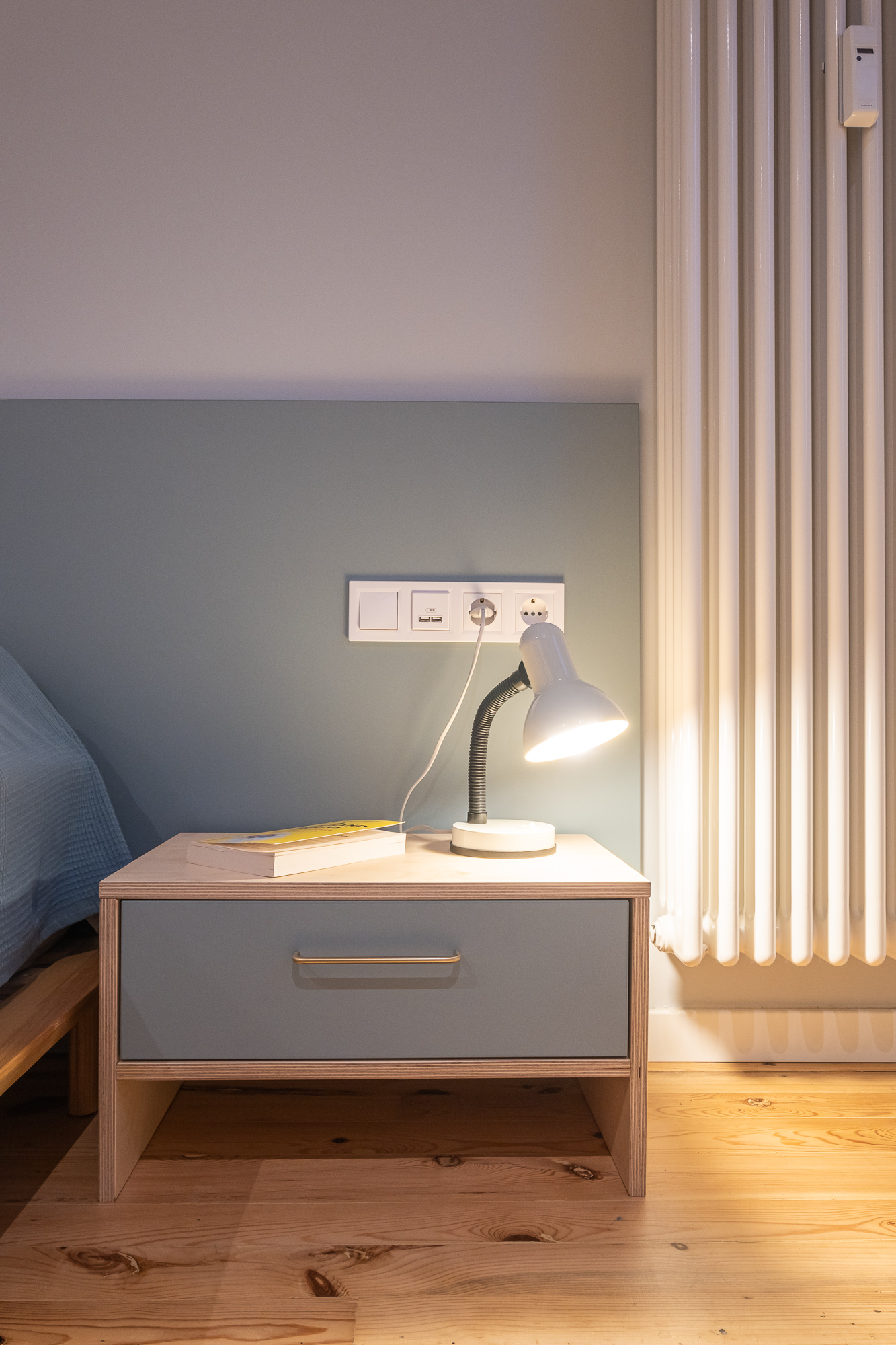 В спалнята гардеробът и тоалетката са изградени от брезов шперплат, комбиниран със светло и по-тъмен нюанс на синьото. Тази корпусна мебел е естествено продължение на библиотеката от всекидневната, тъй като трите помещения са подредени амфиладно, което създава визуална връзка и плавен преход между зоните. Минималистични нощни шкафчета от шперплат допълват интериора, подчертавайки чистите линии и функционалния характер на пространството.